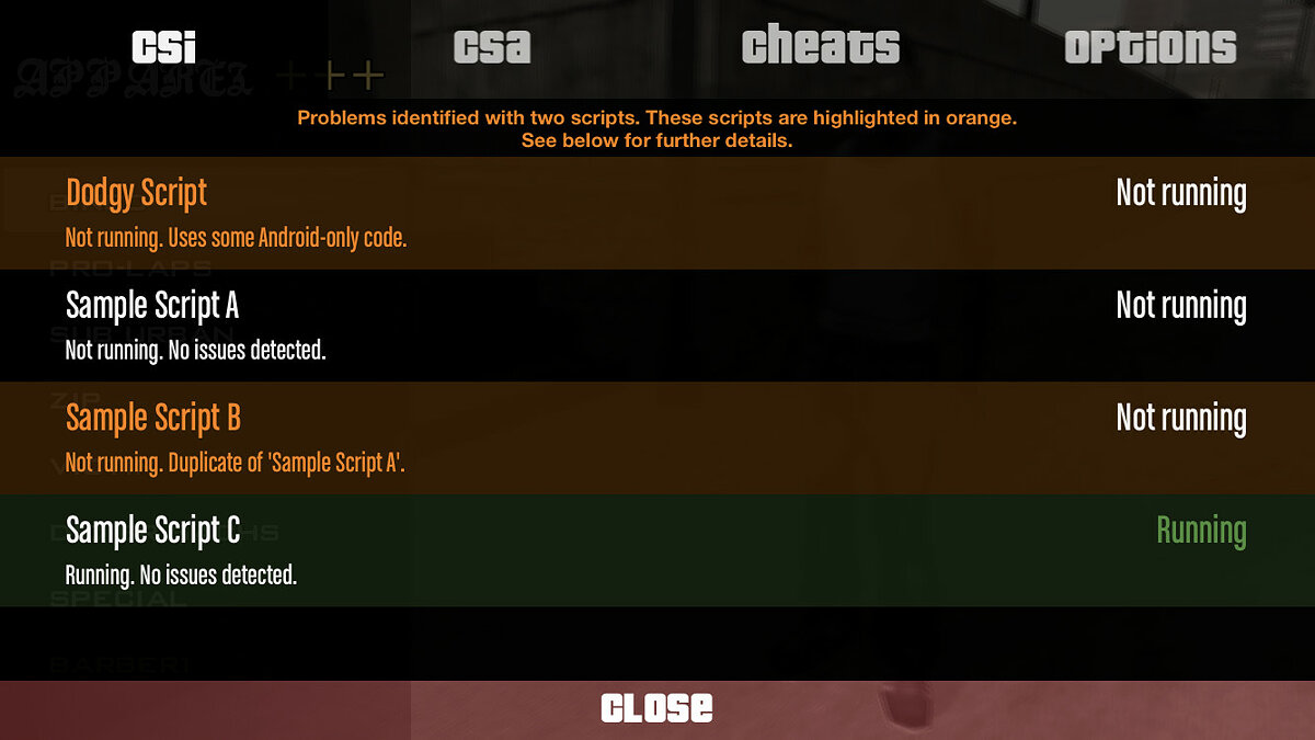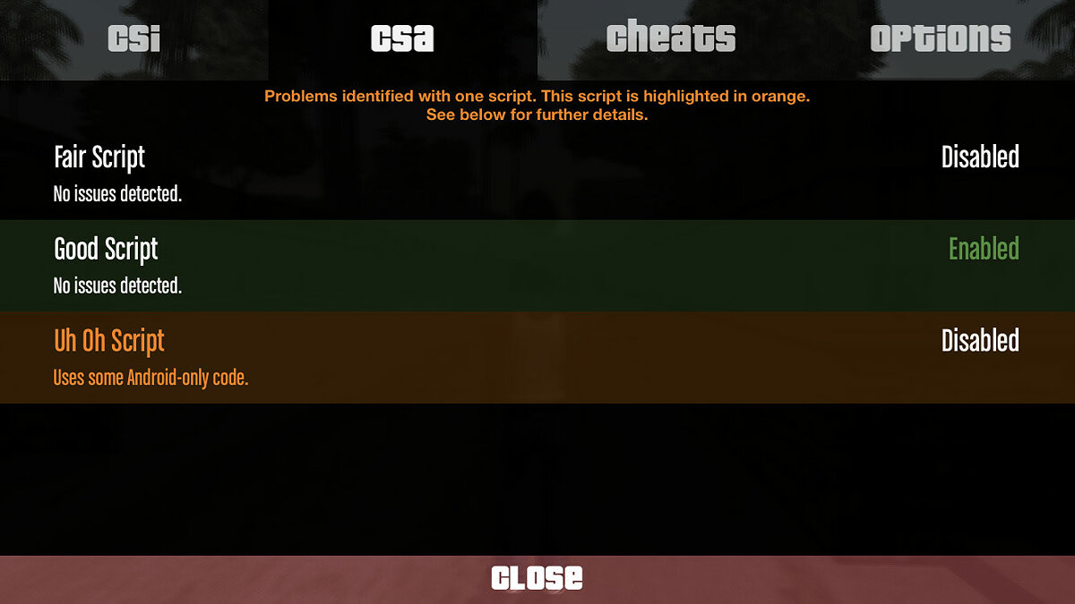 The CSA script (a file with a .csa extension) runs immediately after you load the game. You can disable any of these scripts with the CLEO menu (CSA tab).