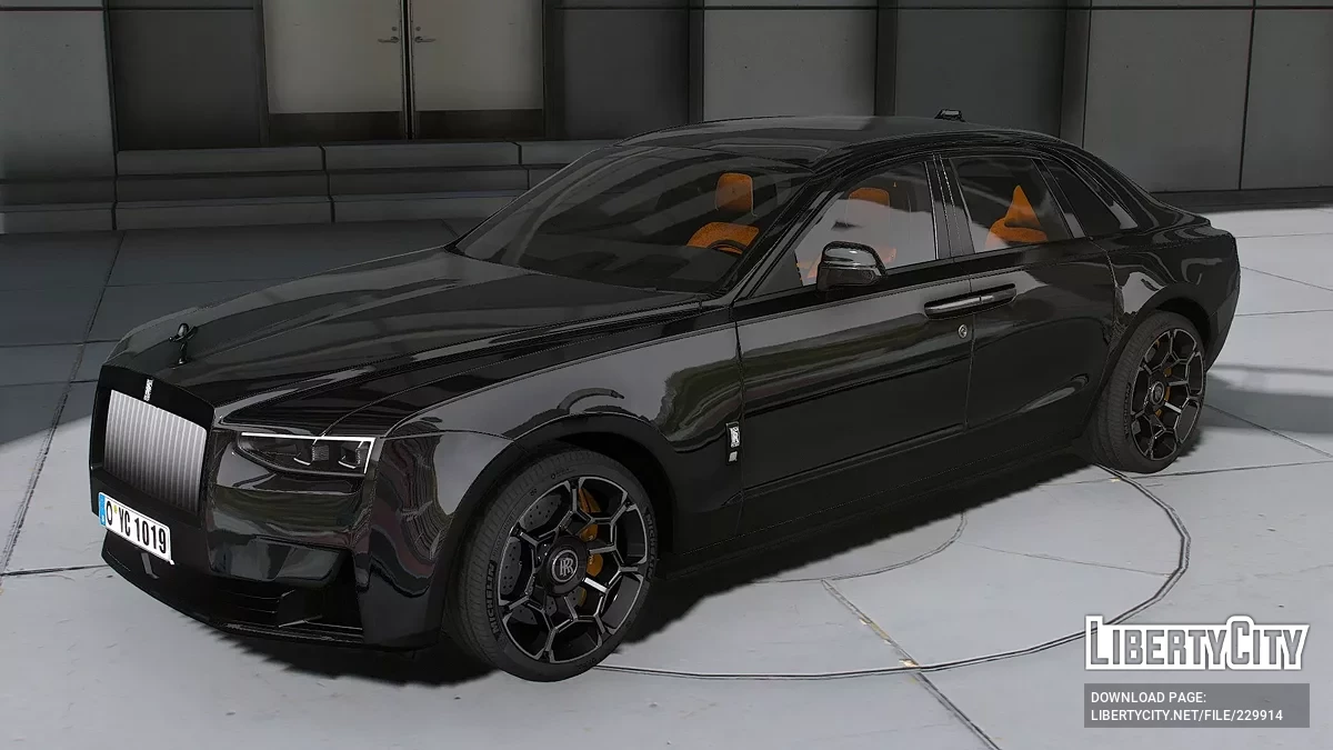 2025 Rolls-Royce Ghost Black Badge for GTA 5. Front: The long hood with the iconic Spirit of Ecstasy ornament emphasizes the status and prestige of the car. The glossy black grille with vertical slats and the Rolls-Royce emblem gives the front a...