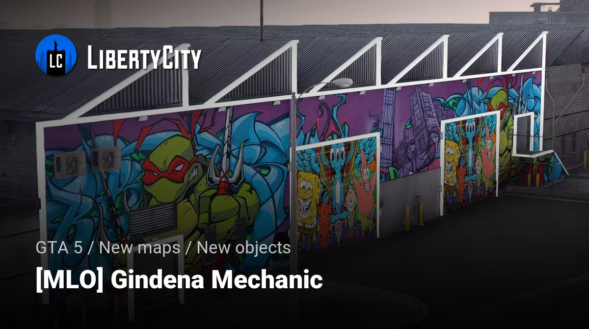 The exterior of Gindena Mechanic is a large industrial building with a gray metal roof and brick walls. The main feature of the facade is a vibrant, large-scale graffiti mural covering the entire front wall. The graffiti depicts famous pop culture characters: a Ninja Turtle with a red bandana, SpongeBob, Patrick, a cartoon cat, and other animated heroes. The artwork is done in rich, contrasting colors, making the building very noticeable and recognizable. The outlines of the building and doors are highlighted with white glowing lines, adding a modern and stylish touch. Overall, the workshop’s appearance is creative, youthful, and stands out thanks to its unique design.