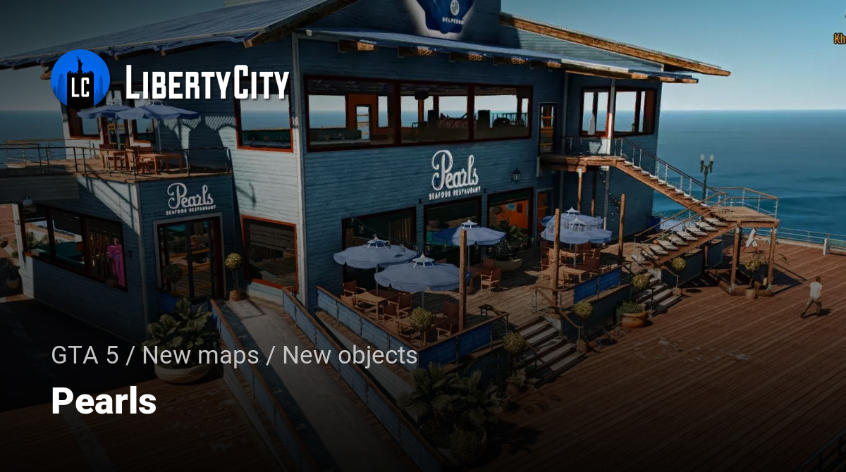 Pearls is a two-story restaurant located on the ocean pier. The building features light blue tones with wooden accents, giving it a cozy, maritime look. The facade displays a large "Pearls" sign along with "Seafood Restaurant." Both the first and second floors have open terraces with wooden tables and blue umbrellas, creating the atmosphere of a seaside summer café. Decorative potted plants surround the building, and wide staircases lead to the entrances on both levels. Panoramic windows offer stunning ocean views. The overall style is modern with touches of beachside comfort.