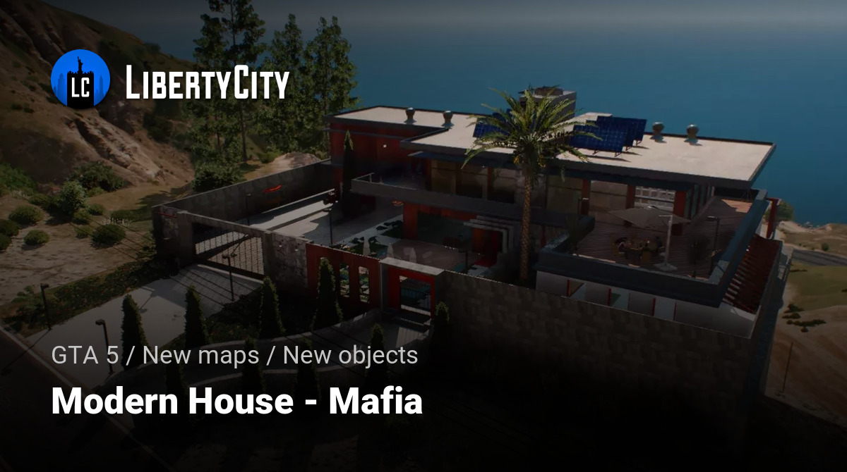 A modern mafia-style mansion situated on a hillside with stunning ocean views. The house features a strict and minimalist architectural design: clean lines, a flat roof, large panoramic windows, and spacious terraces. The facade combines natural stone, concrete, and glass, giving the building a solid and contemporary look. At the entrance, you’ll find a well-maintained pathway surrounded by tall decorative bushes and massive gates that ensure privacy. The property is enclosed by a high fence, with palm trees and lush greenery inside, creating an atmosphere of luxury and seclusion. Solar panels are installed on the roof, emphasizing the technological aspect of the house. The terrace offers a lounge area with furniture and umbrellas—an ideal place for meetings and negotiations in true mafia style.