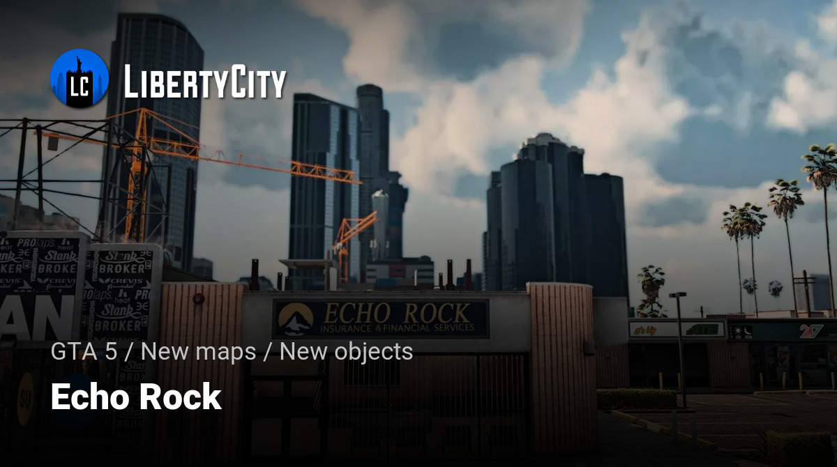 Echo Rock is a single-story building with a facade made of light-colored stone or concrete, featuring vertical ribbed elements. The central part of the facade stands out with a dark sign displaying the gold lettering "ECHO ROCK INSURANCE & FINANCIAL SERVICES" and a logo depicting a mountain against the sun. The entrance area consists of glass doors and large windows protected by metal grilles. Massive columns flank both sides of the entrance. The building has a modern and neat appearance, blending well into the urban landscape, with skyscrapers and construction cranes visible in the background. Nearby, there are other commercial spaces, a parking lot, and palm trees, adding a touch of Californian atmosphere.