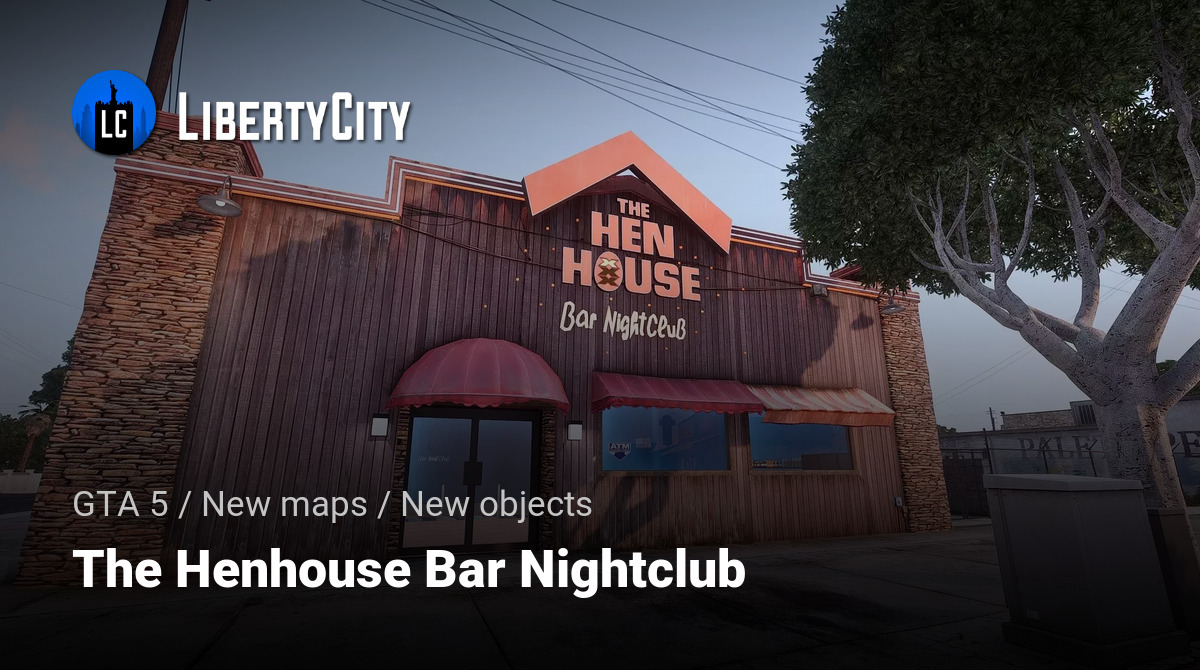 The Henhouse Bar Nightclub building is designed in the style of a classic American roadside establishment. Its facade features dark wooden panels and is accented on the sides with light natural stonework. Above the main entrance, there is a prominent awning with a red roof and a large sign reading "The Hen House Bar Nightclub" in bold white and orange letters. The entrance doors are glass, topped with a red canopy, and there is a large window with a matching awning nearby. The exterior looks cozy yet simple, emphasizing the atmosphere of a small but popular bar. Neatly trimmed trees grow nearby, and the building is situated on a street corner, making it easily noticeable to passersby and visitors.