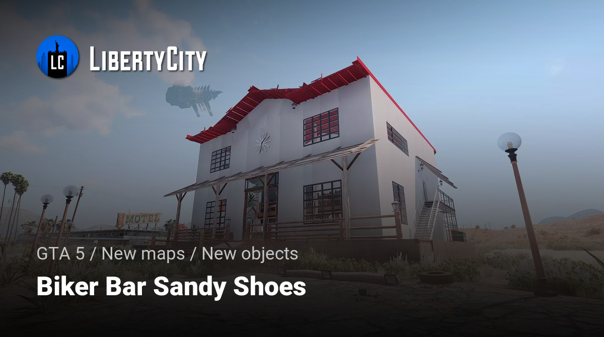 Biker Bar Sandy Shoes is a two-story building with white walls and a bright red roof, located in a desert area. The facade features large black windows with metal grilles, and a simple wooden porch with a canopy above the main entrance. A staircase on the side leads up to the building, surrounded by dry grass and shrubs that emphasize its neglected and secluded atmosphere. In front of the bar, there are street lamps with round shades, some of which are slightly tilted. In the distance, you can see a motel sign, and the surroundings are filled with a typical desert landscape, including palm trees and sparse vegetation.