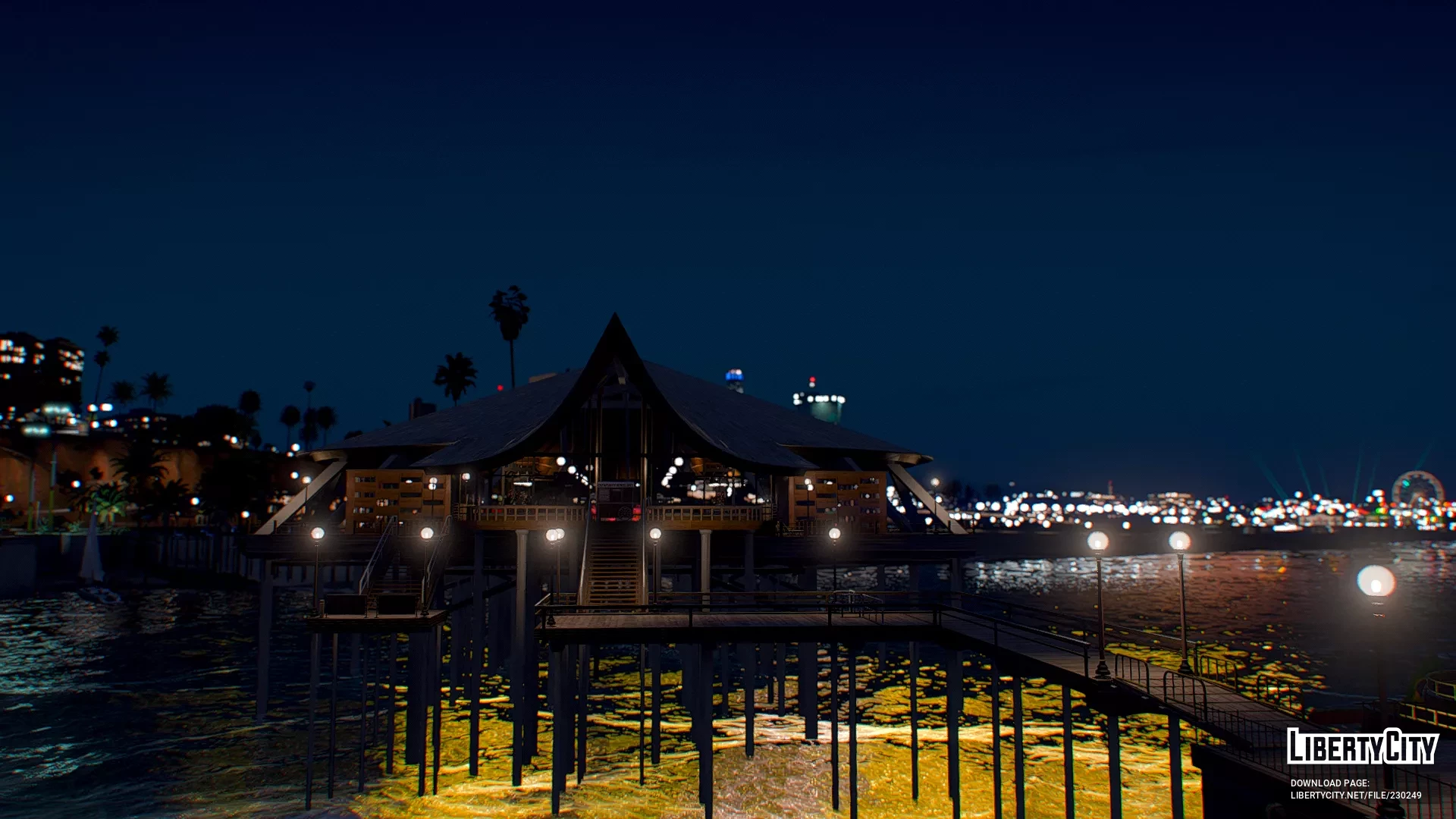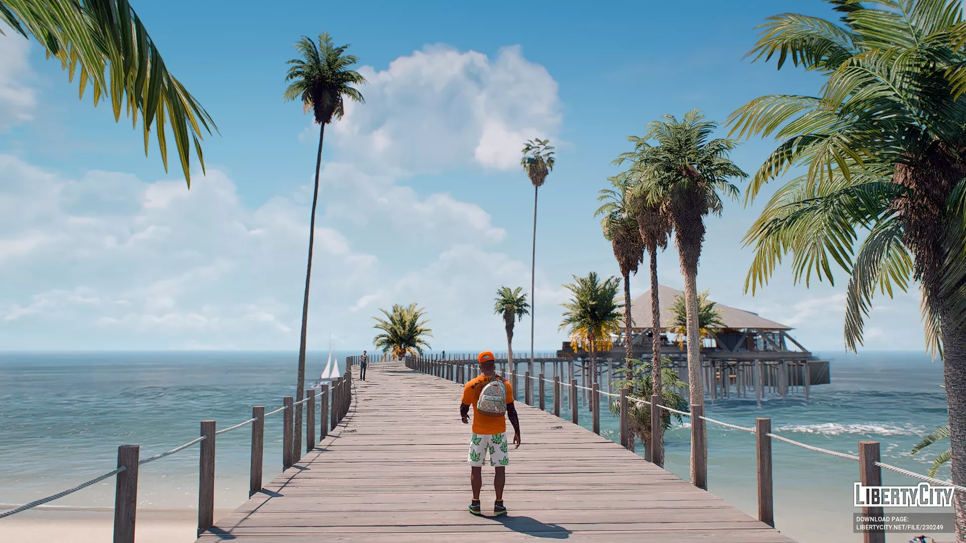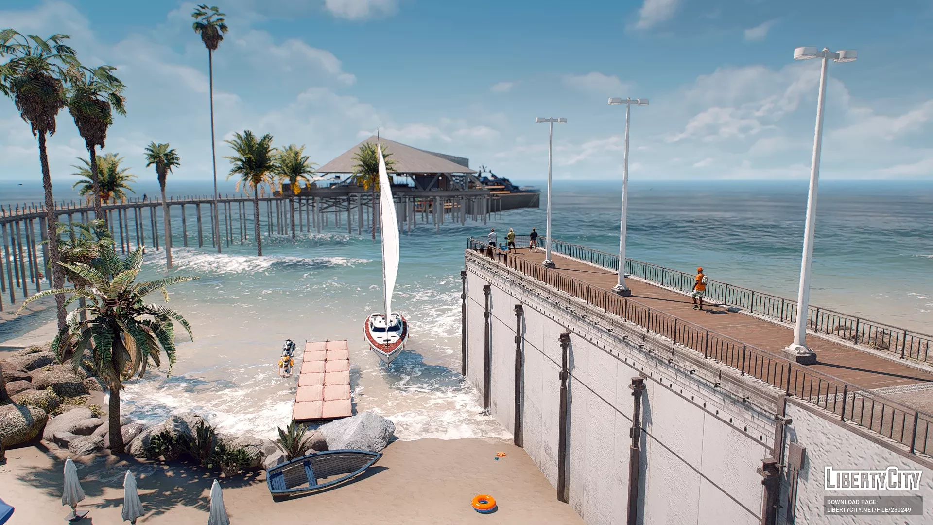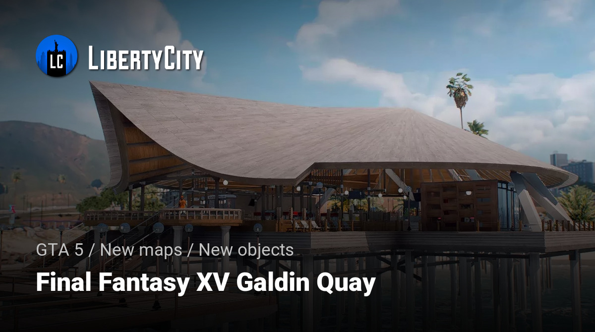 Galdin Quay is a picturesque coastal location designed in the style of a luxury resort. Its main feature is a large wooden pier stretching out into the azure ocean waters. On the pier, there is a building with a pointed roof, resembling a modern restaurant or lounge area where guests gather. Palm trees grow all around, adding to the tropical vacation vibe. Expensive sports cars can be seen parked nearby, while the area itself is decorated with modern architectural elements and street lighting. The atmosphere here is relaxed and resort-like, with ocean views creating the feeling of a secluded paradise.