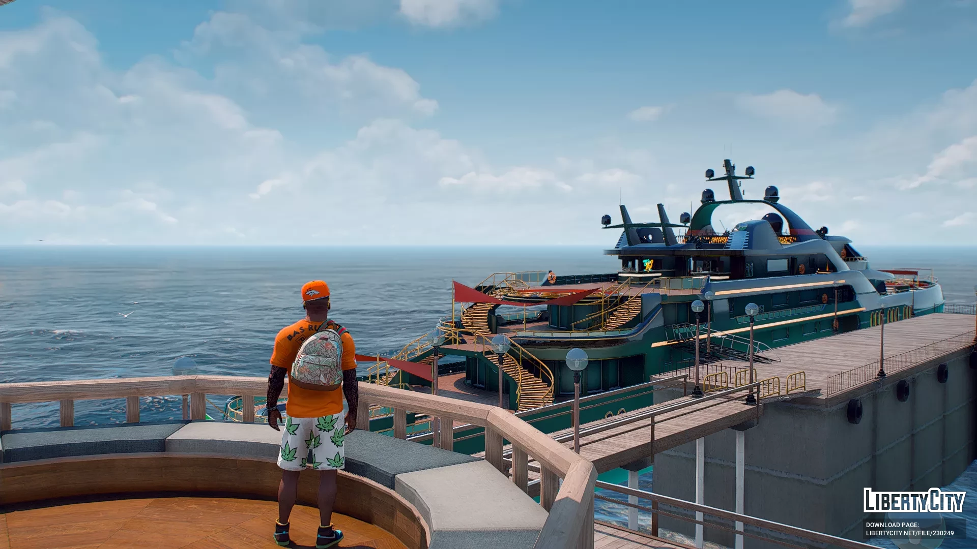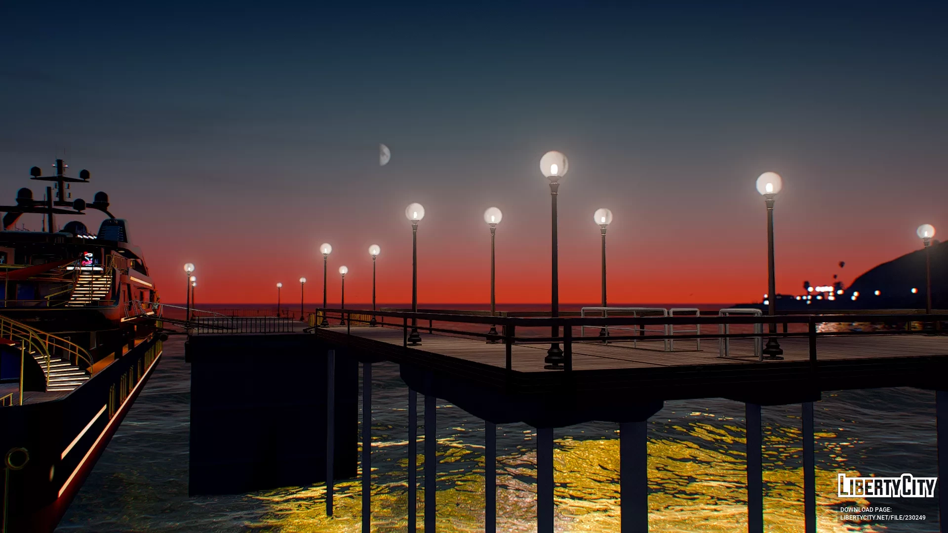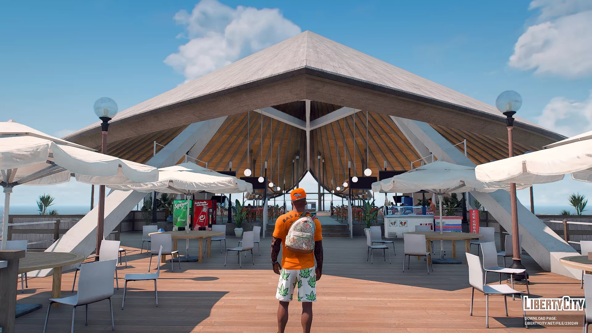 Galdin Quay is a picturesque coastal location designed in the style of a luxury resort. Its main feature is a large wooden pier stretching out into the azure ocean waters. On the pier, there is a building with a pointed roof, resembling a modern restaurant or lounge area where guests gather. Palm trees grow all around, adding to the tropical vacation vibe. Expensive sports cars can be seen parked nearby, while the area itself is decorated with modern architectural elements and street lighting. The atmosphere here is relaxed and resort-like, with ocean views creating the feeling of a secluded paradise.