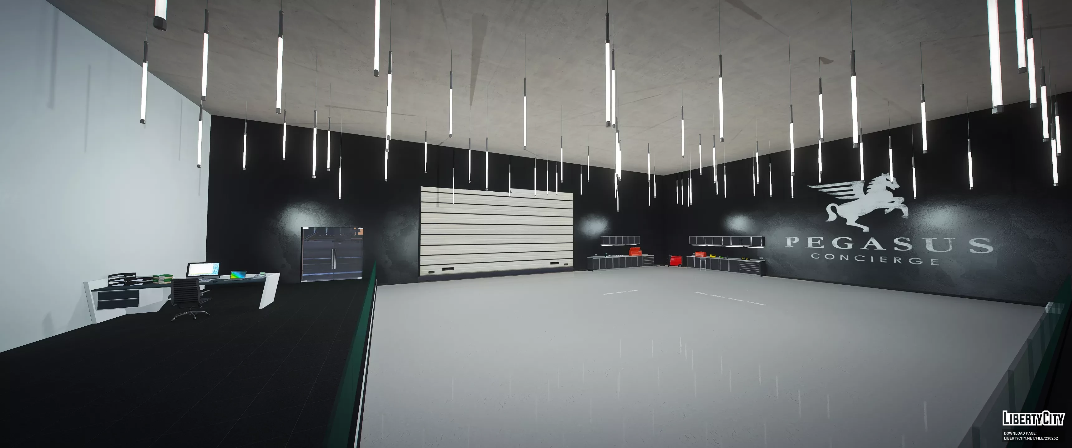 The building is designed in a modern industrial style, featuring light gray and white tones. Its facade is made up of large glass panels and smooth concrete walls. The ground floor has wide, tinted windows and large gates displaying the Pegasus logo. On the side, there is a metal emergency staircase with railings that leads to the upper levels. Exterior staircases and fire exits are located around the perimeter of the building. The architecture is strict and functional, with minimalist elements and a focus on practicality. In the background, a clear sky and sunset lighting give the facade soft golden hues.