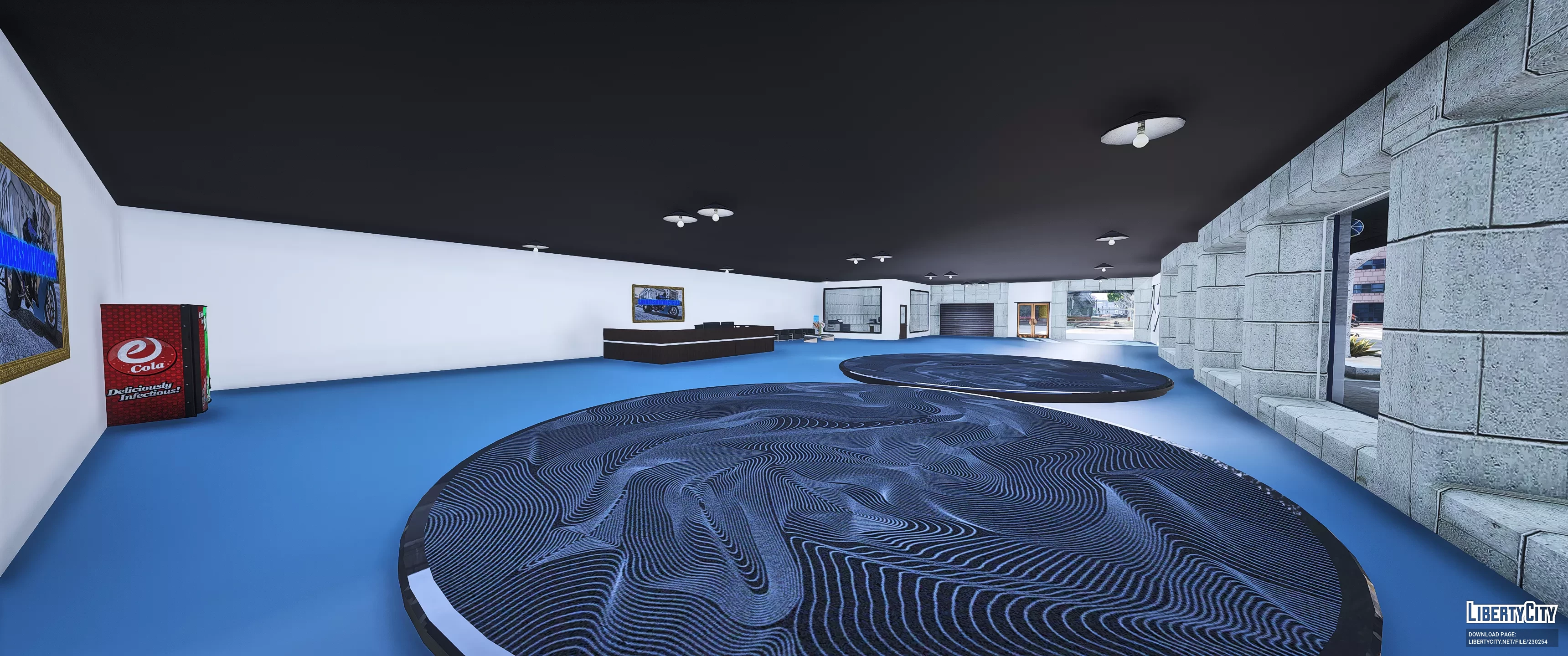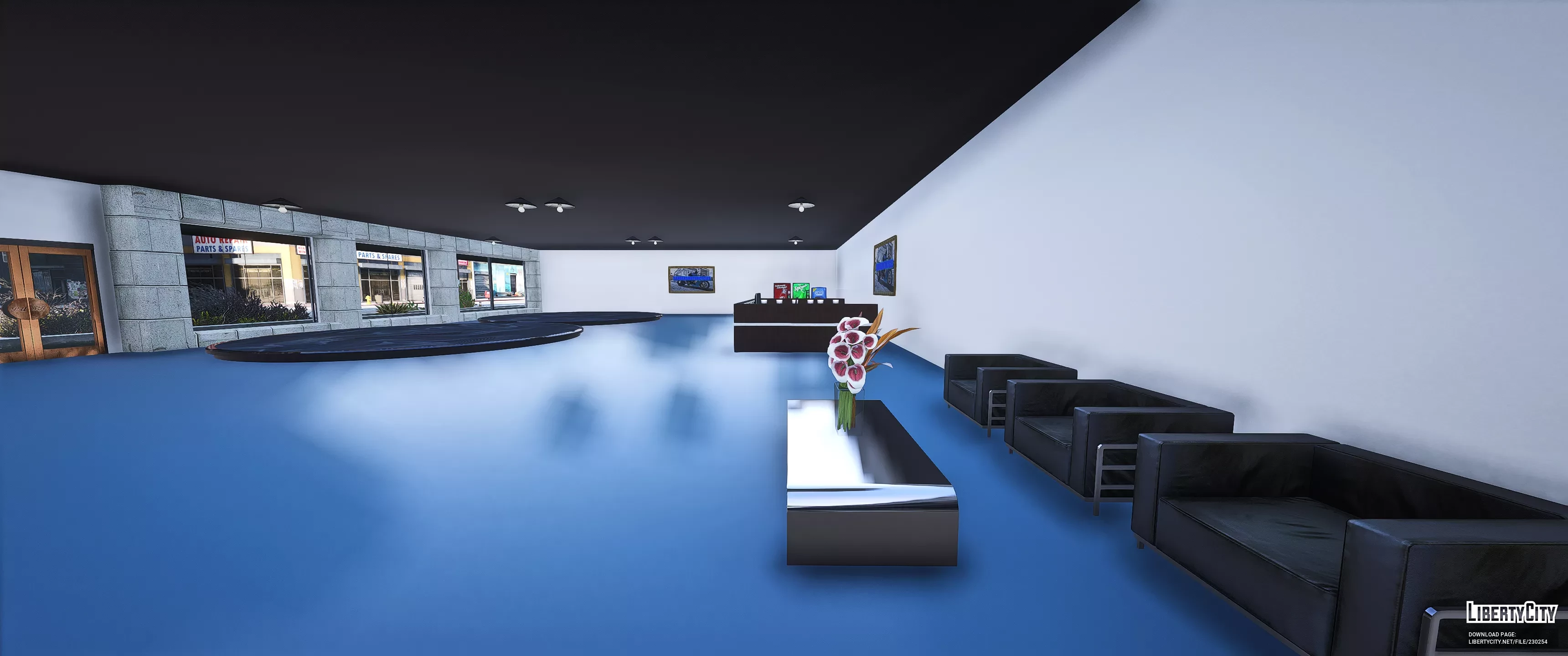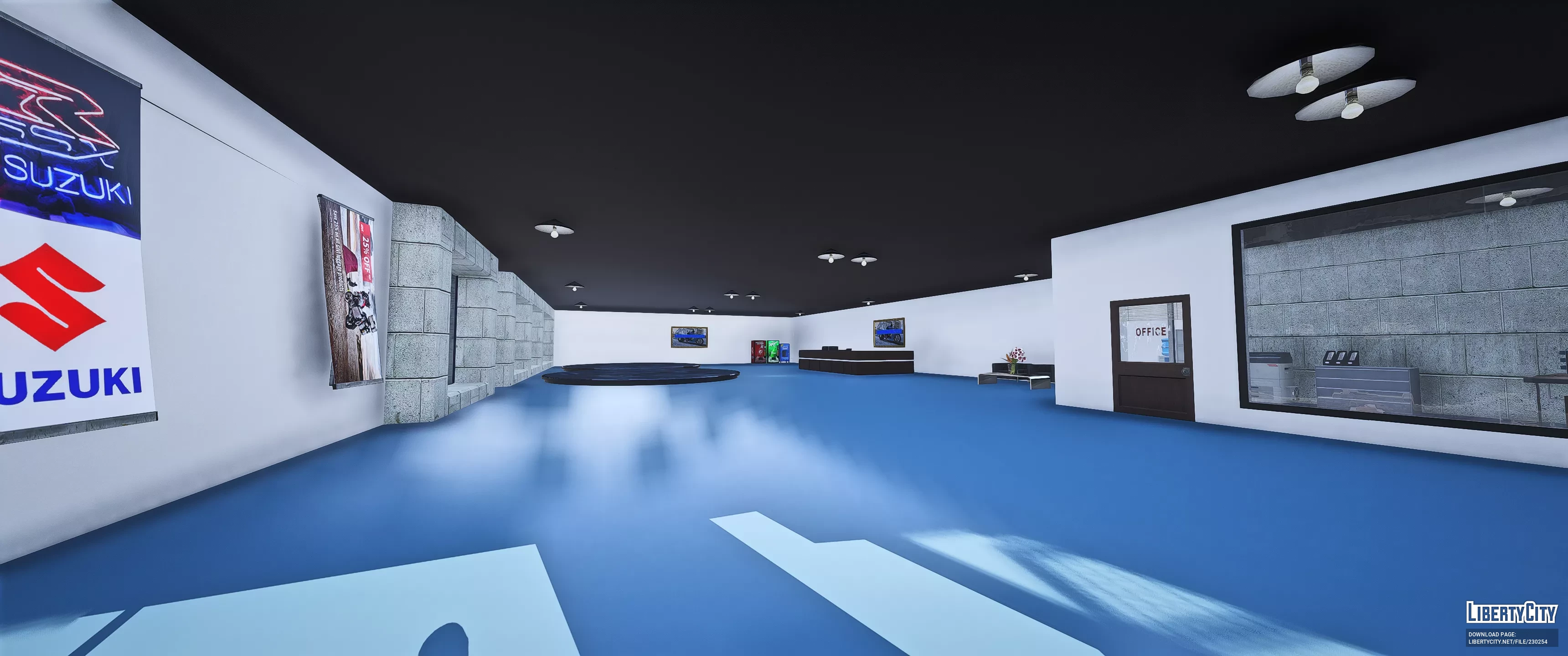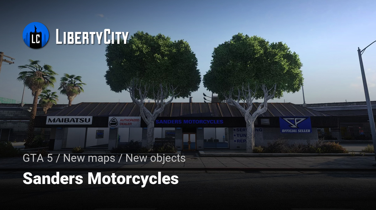 The Sanders Motorcycles building is a single-story structure with a flat roof and a modern facade. Large display windows at the front allow a clear view of the showroom interior. A bright blue sign reading "SANDERS MOTORCYCLES" is prominently displayed in the center of the facade. To the left of the entrance, you'll find a "MAIBATSU" sign and an authorized dealer badge, while on the right there is an "OFFICIAL SELLER" banner with a logo. Three large trees with dense foliage grow in front of the building, and decorative bushes and plants are arranged along the sides. The wide, clean sidewalk in front of the shop is lined with street lamps. Overall, the building has a modern and well-maintained appearance, with a strong emphasis on a motorcycle theme.