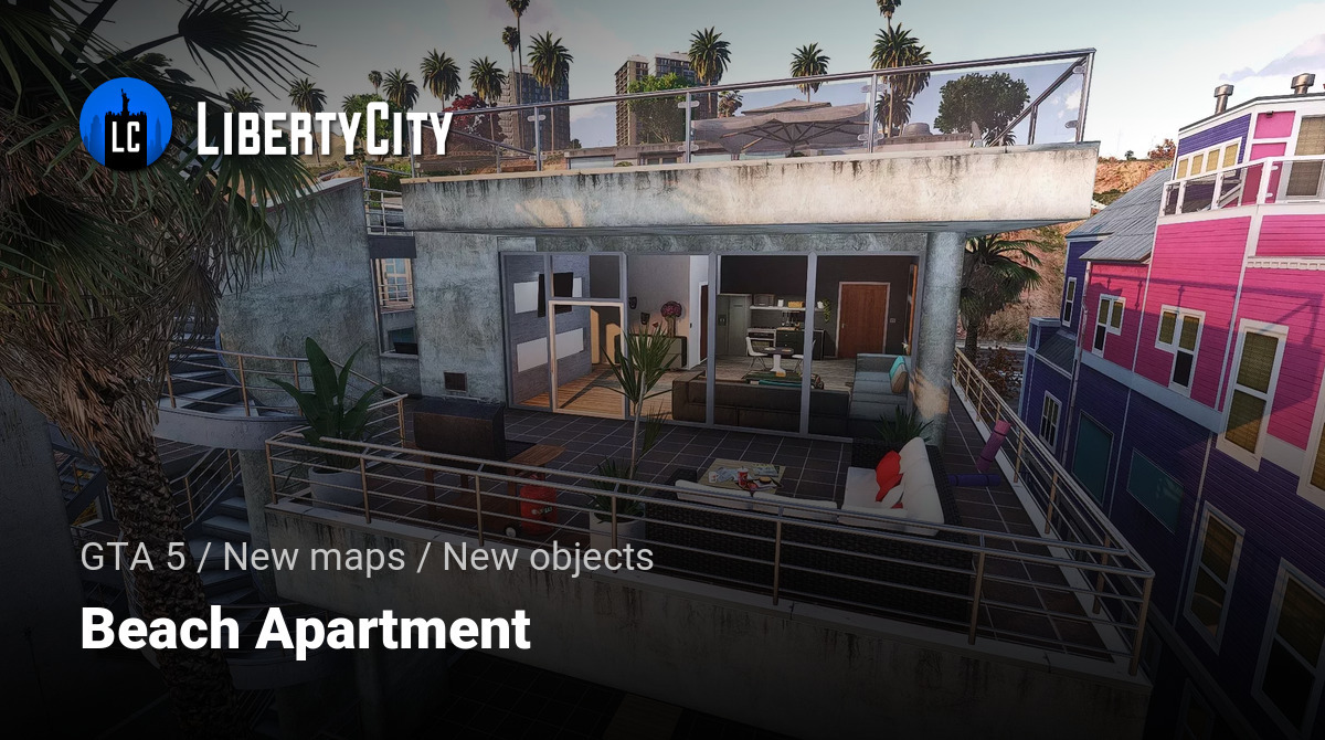 The Beach Apartment is designed in a modern style with minimalist elements. The building features concrete walls with a subtle aged effect, creating a cozy and tranquil atmosphere. A spacious terrace with metal railings surrounds the apartment, offering views of palm trees and vibrant neighboring houses painted in rich pink and purple tones. The terrace is furnished with stylish outdoor sofas, armchairs, tables, and potted green plants, enhancing the relaxing seaside vibe. Large panoramic windows reveal a contemporary interior that seamlessly combines the living room and kitchen. The exterior of the apartment blends perfectly into the coastal landscape, highlighting the laid-back lifestyle by the ocean.