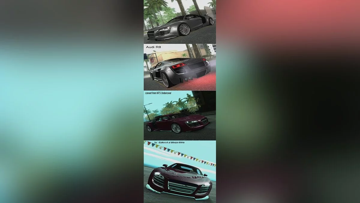 Audi R8 for GTA San Andreas. Features: - High-quality model. - Your settings. - Your shadow. - The texture of the engine. - Customized collision.