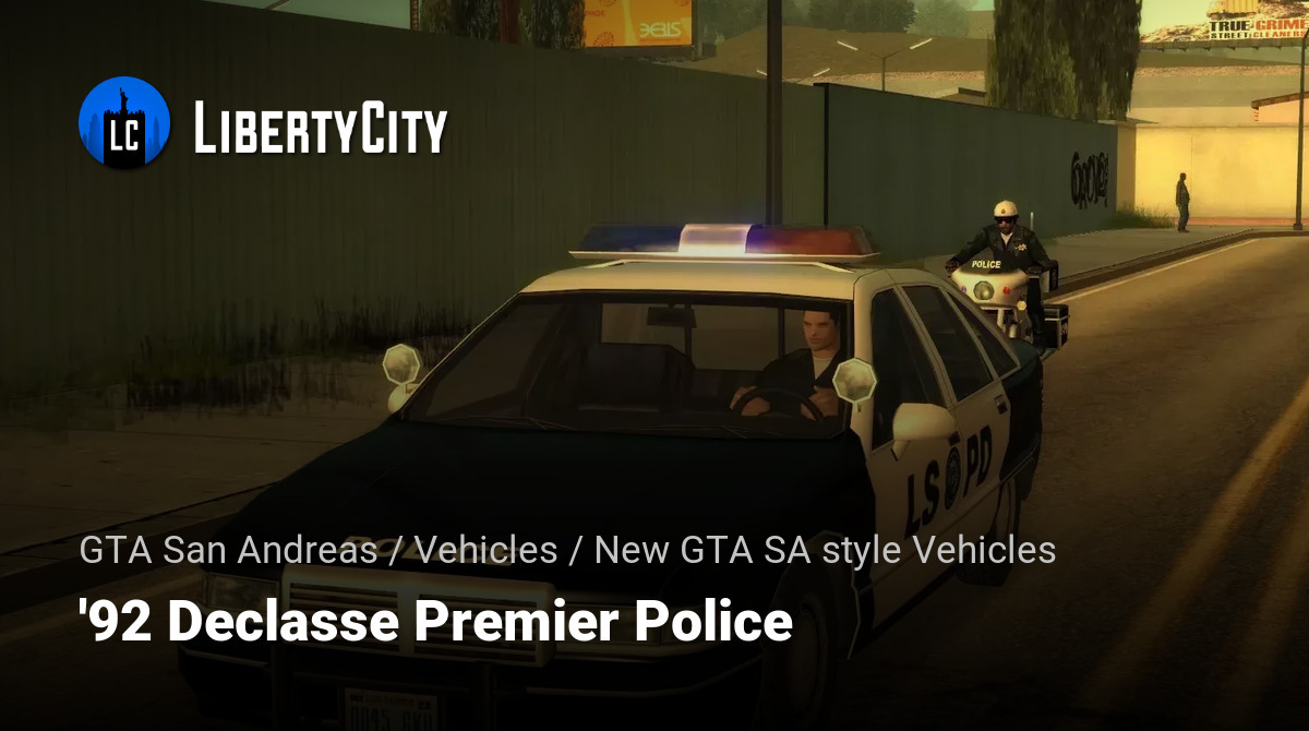 This is a lore-friendly police sedan for GTA: San Andreas, based on the civilian version of the Declasse Premier '92. The model is fully adapted to the style of the game and reflects the atmosphere of police cars of the early 90s, with several extras.