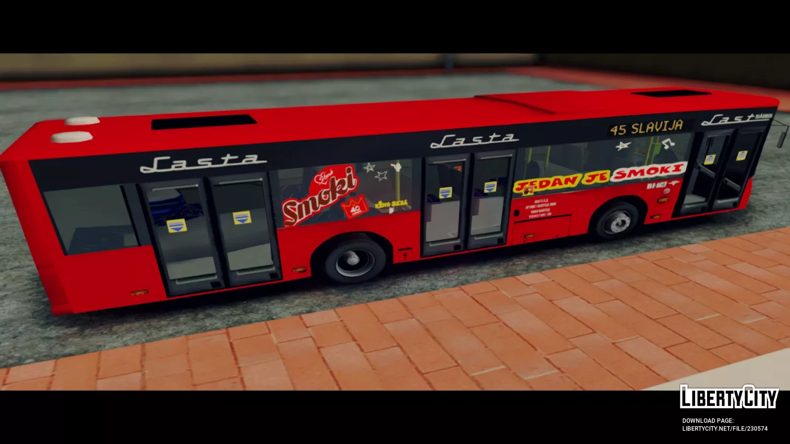 Ikarbus IK-112N Lasta-Smoki is a Serbian-made city bus decorated in the bright advertising livery of the popular snack Lasta-Smoki. It is used for passenger transportation on urban routes and stands out due to its unique design.