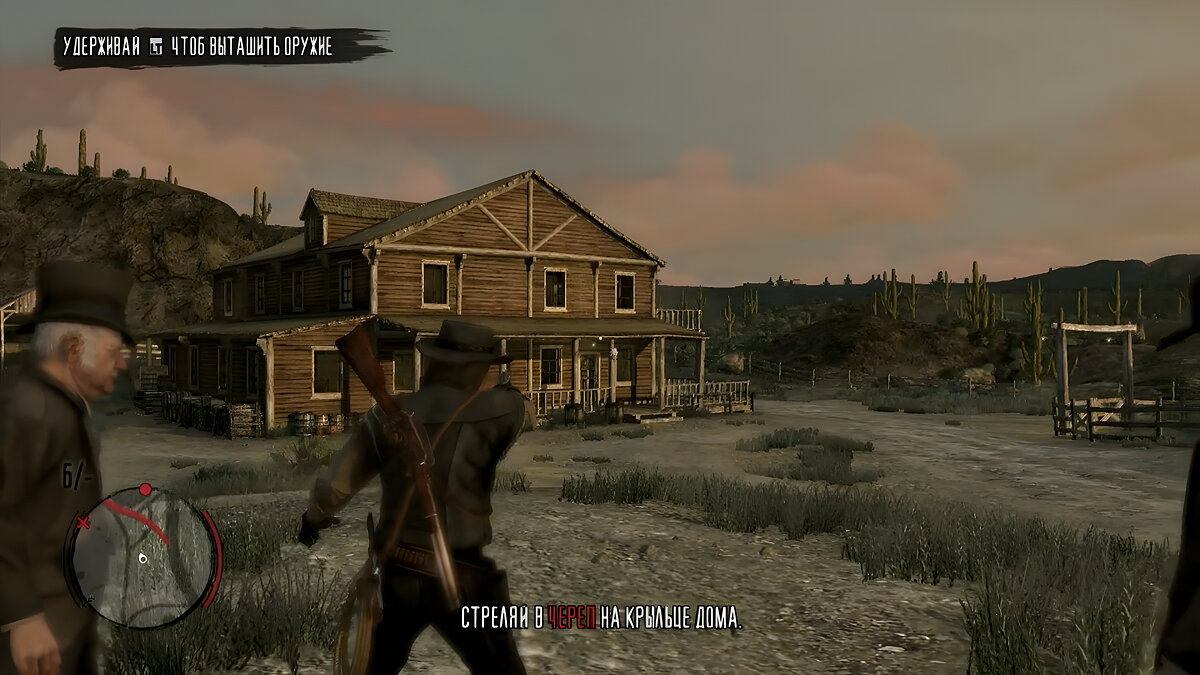 Upon reaching the spot marked by the yellow marker on the map, you will see Dickens brazenly deceiving the farm settlers, passing off his medicine as a drink that will restore youth. He will present the main character as a patient taking this drink. To prove it to the others, you need to hit the skull on the porch of the house accurately.