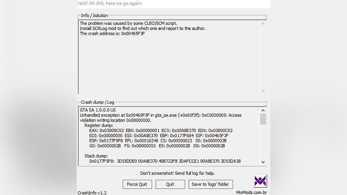 Eu estou usando o crash info. Meu jogo trava e diz a seguinte frase.
