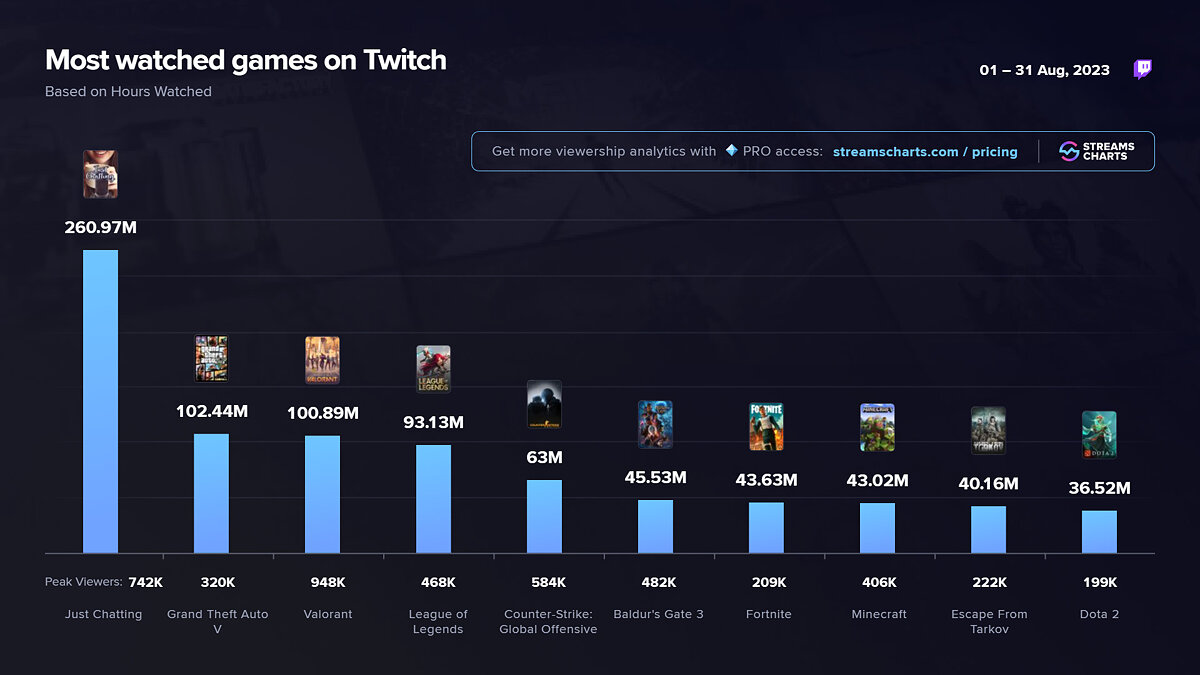 The analytics service Streams Charts has reported that GTA 5 became the most-watched game on Twitch in August 2023. Rockstar's project surpassed hits like League of Legends, Counter-Strike: Global Offensive, Fortnite, Minecraft, Dota 2, Baldur's Gate 3, as well as Valorant, which had a major tournament.