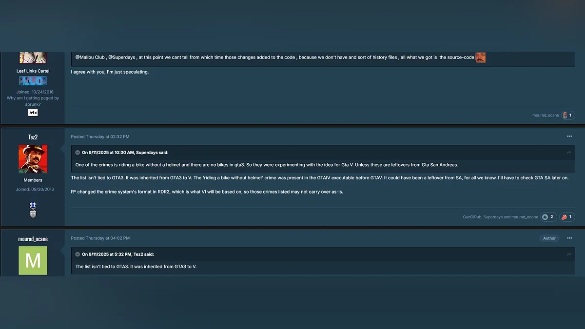 The dataminer revealed this on a fan forum during a discussion of the 2022 source code for Rage Engine. One user discovered unused functions such as speeding fines in the GTA 5 files, leading many fans to speculate that similar features could carry over to the sixth installment. Tez2 dismissed these assumptions, stating: "R* changed the crime system's format in RDR2, which is what VI will be based on, so those crimes listed may not carry over as-is."