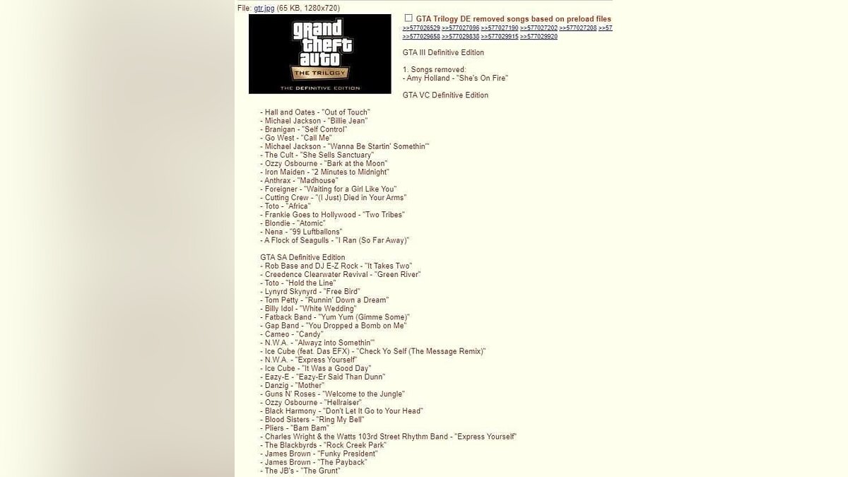 4chan leak claimed that a lot of music tracks will be removed from Grand Theft Auto: The Trilogy – The Definitive Edition due expired license. The list consists of Hall and Oates, Michael Jackson, Go West, Guns and Roses and a lot of other artists.