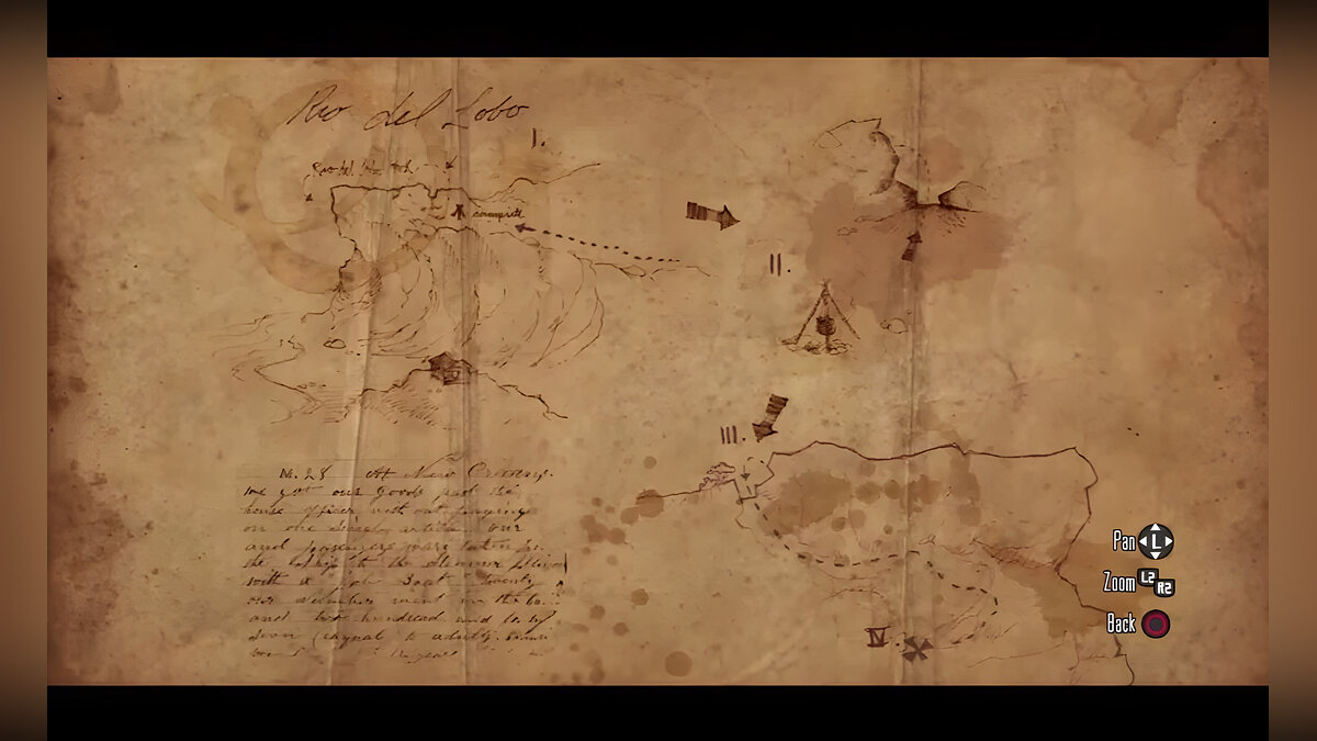 Head to Rio del Lobo to Del Lobo Rock. Moving south in this area, follow the main road that climbs to the river. When the road ends at a campsite, face the river to see a gap in the ridge marked on the treasure map. The treasure is located on the other side of the rock, on a ledge. To reach it, walk around the rock on the right, then keep to the left as you descend.