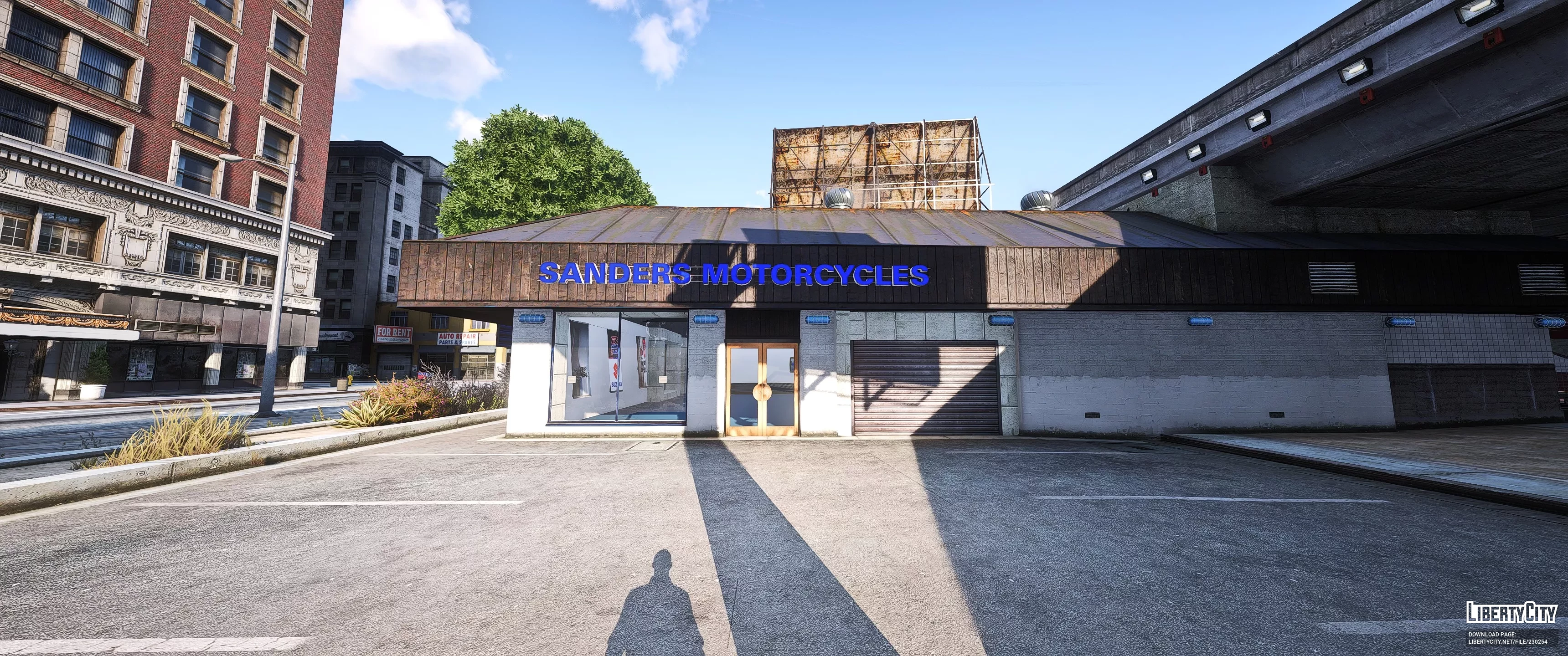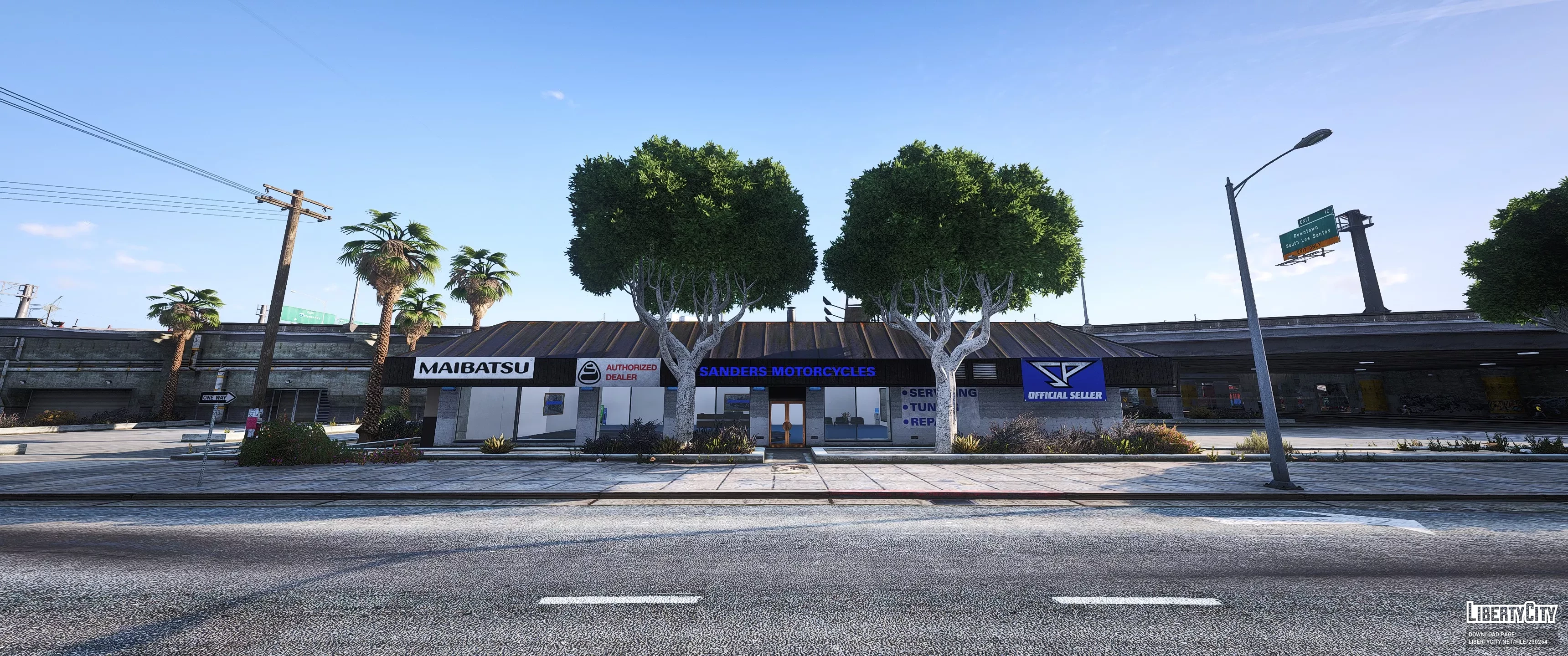 Sanders Motorcycles for GTA 5 The Sanders Motorcycles building is a single-story structure with a flat roof and a modern facade. Large display window...