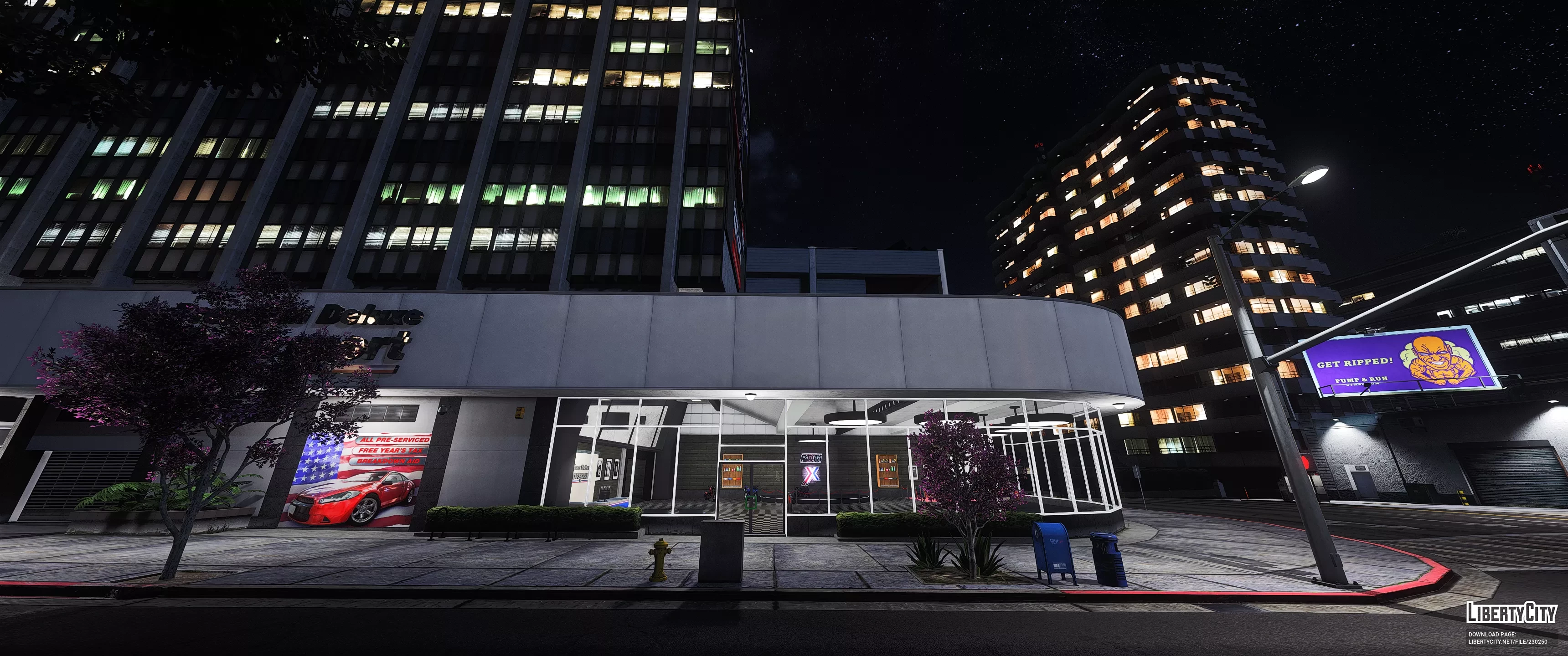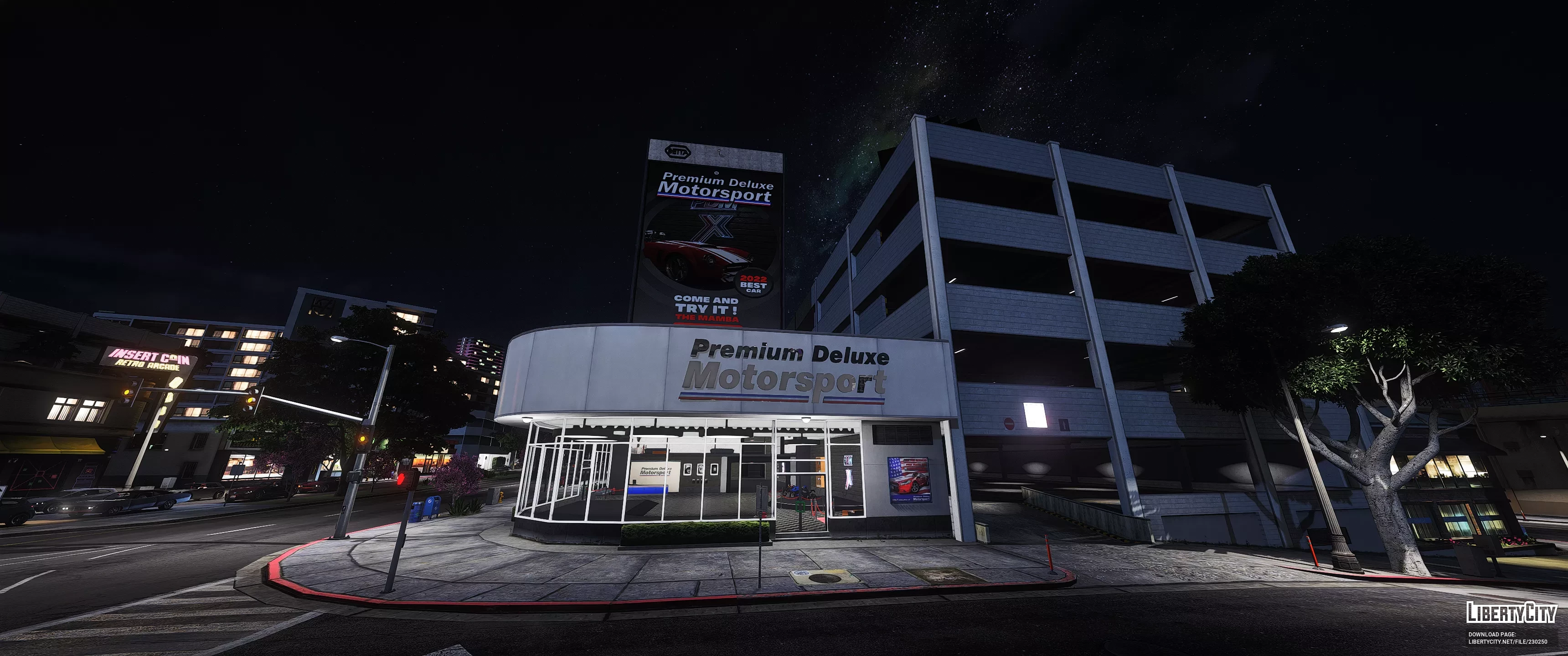 Editable Car Dealer for GTA 5. The car dealership is located on the corner of a busy street and stands out with its modern design. The building'...